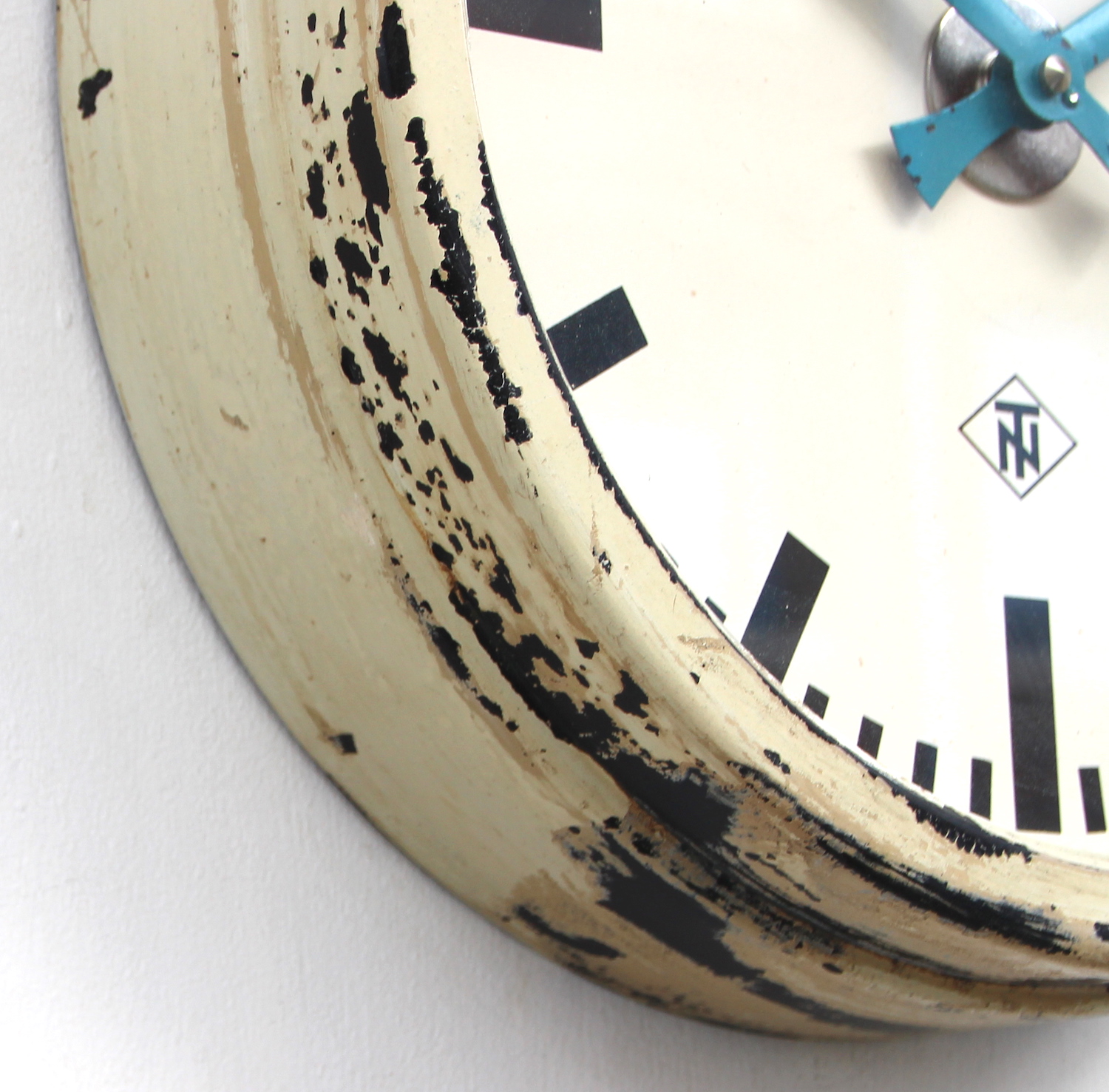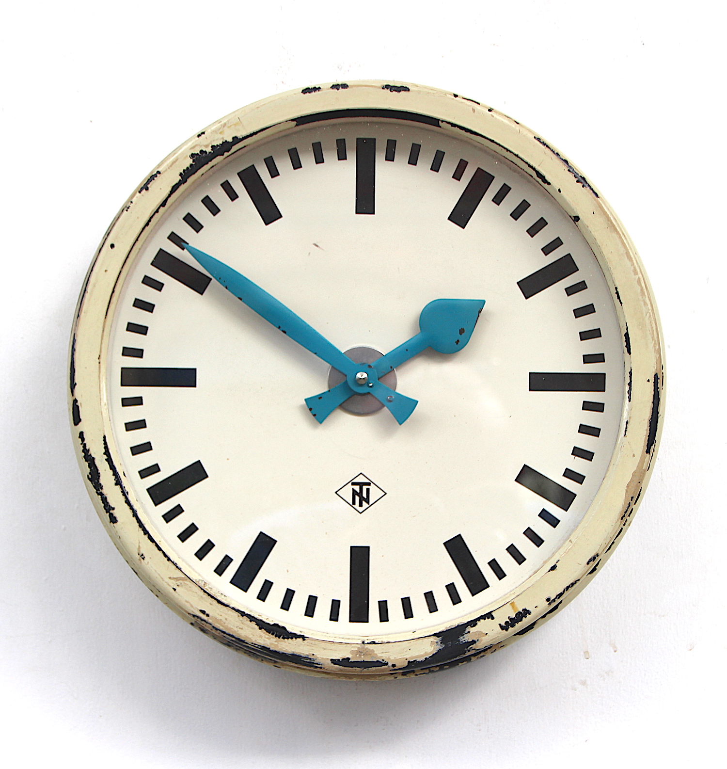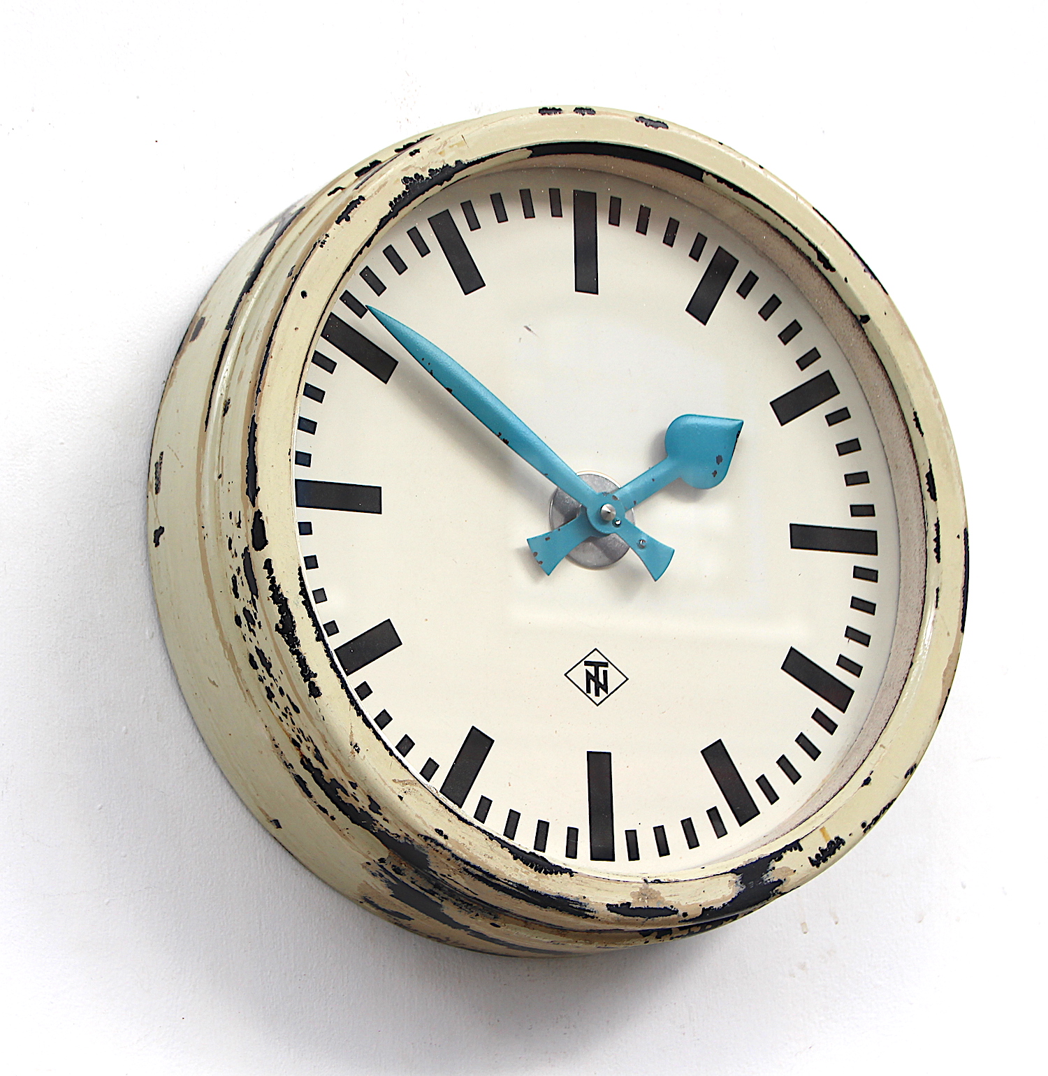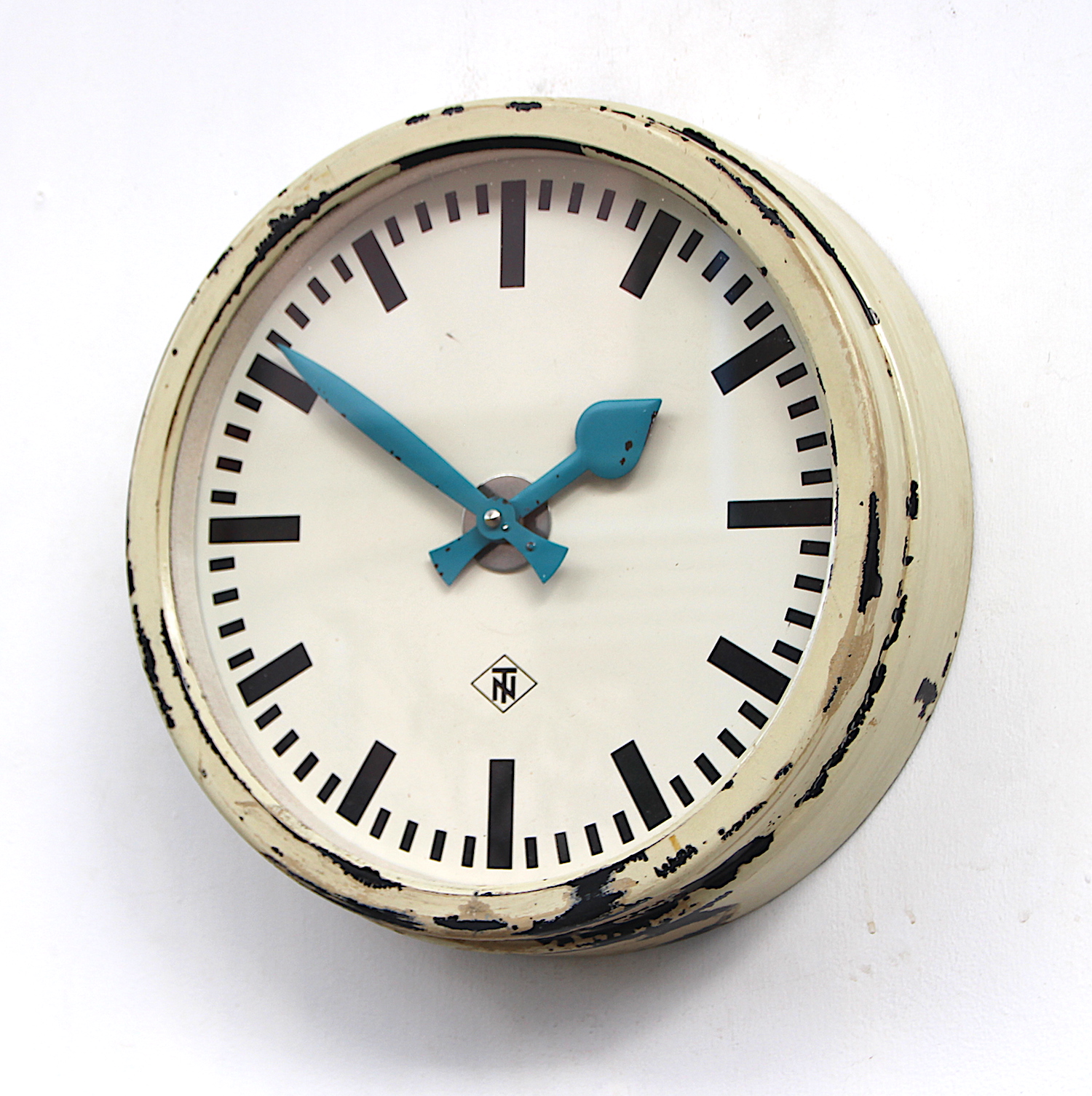 A well aged factory/industrial vintage wall clock. Made by Telefonbau Normalzeit for Deutsche Bahn (German Railways) and dates from the 1960s.