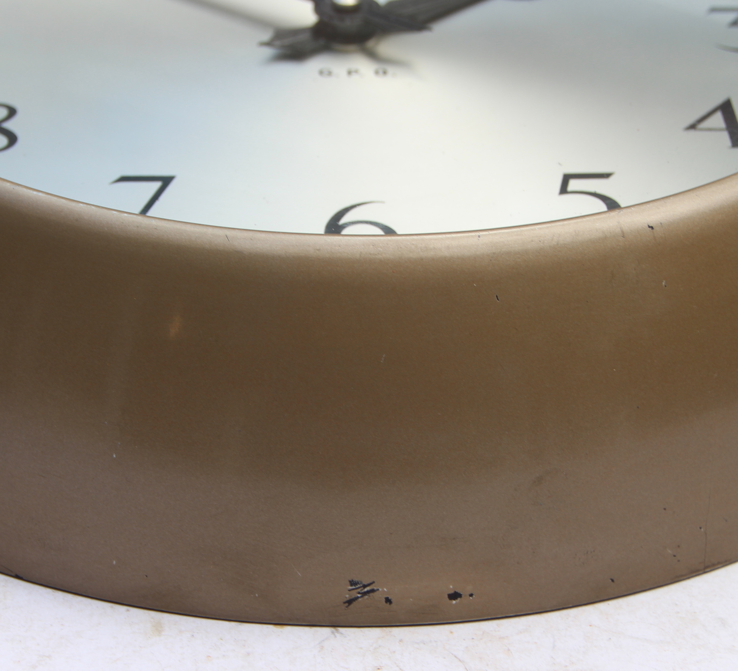 The bakelite case with its original bronze lacquer finish is in nice overall condition and has been cleaned and hand-finished. There are a few marks. The dial is spun aluminium and is in good order. The hands are all in good order. The glass is in good order with a few light marks commensurate with its age.