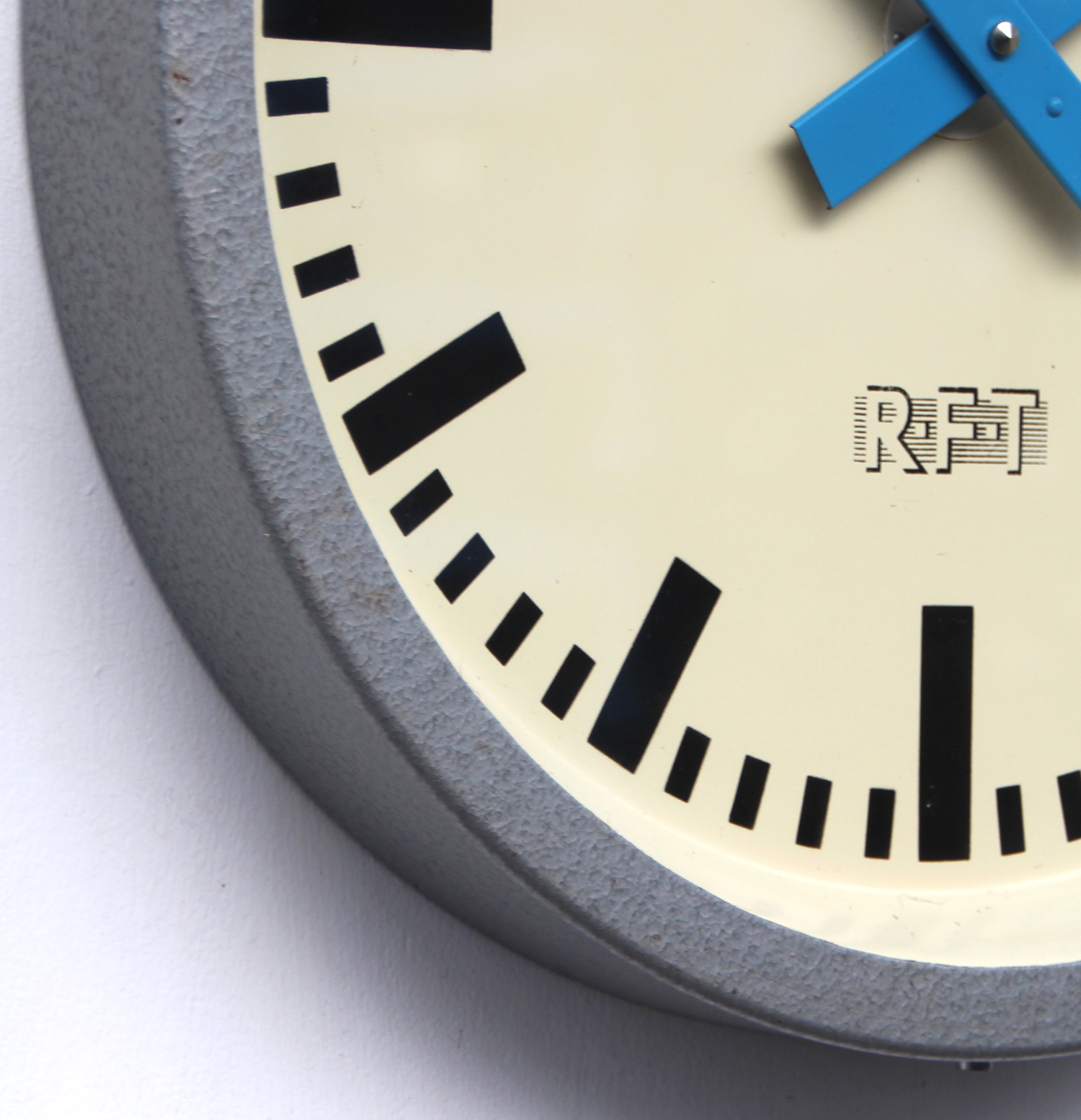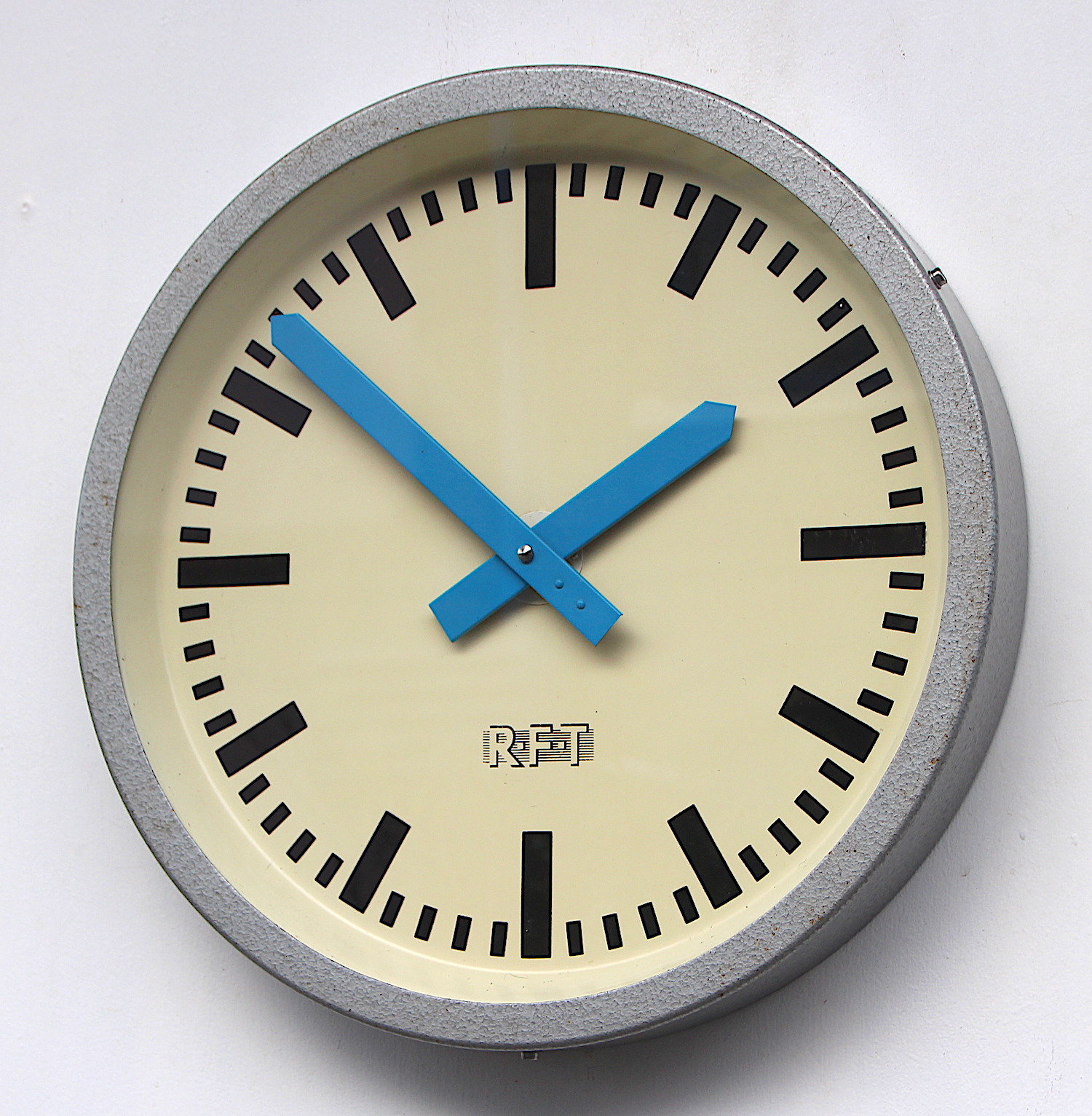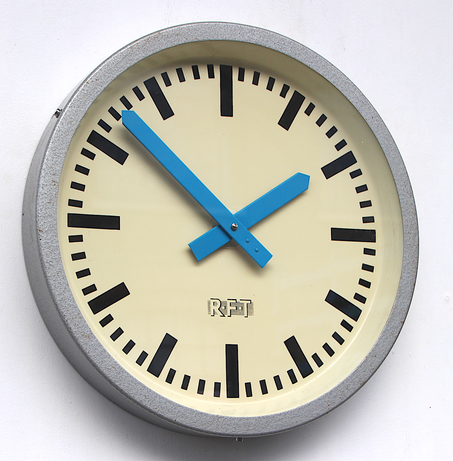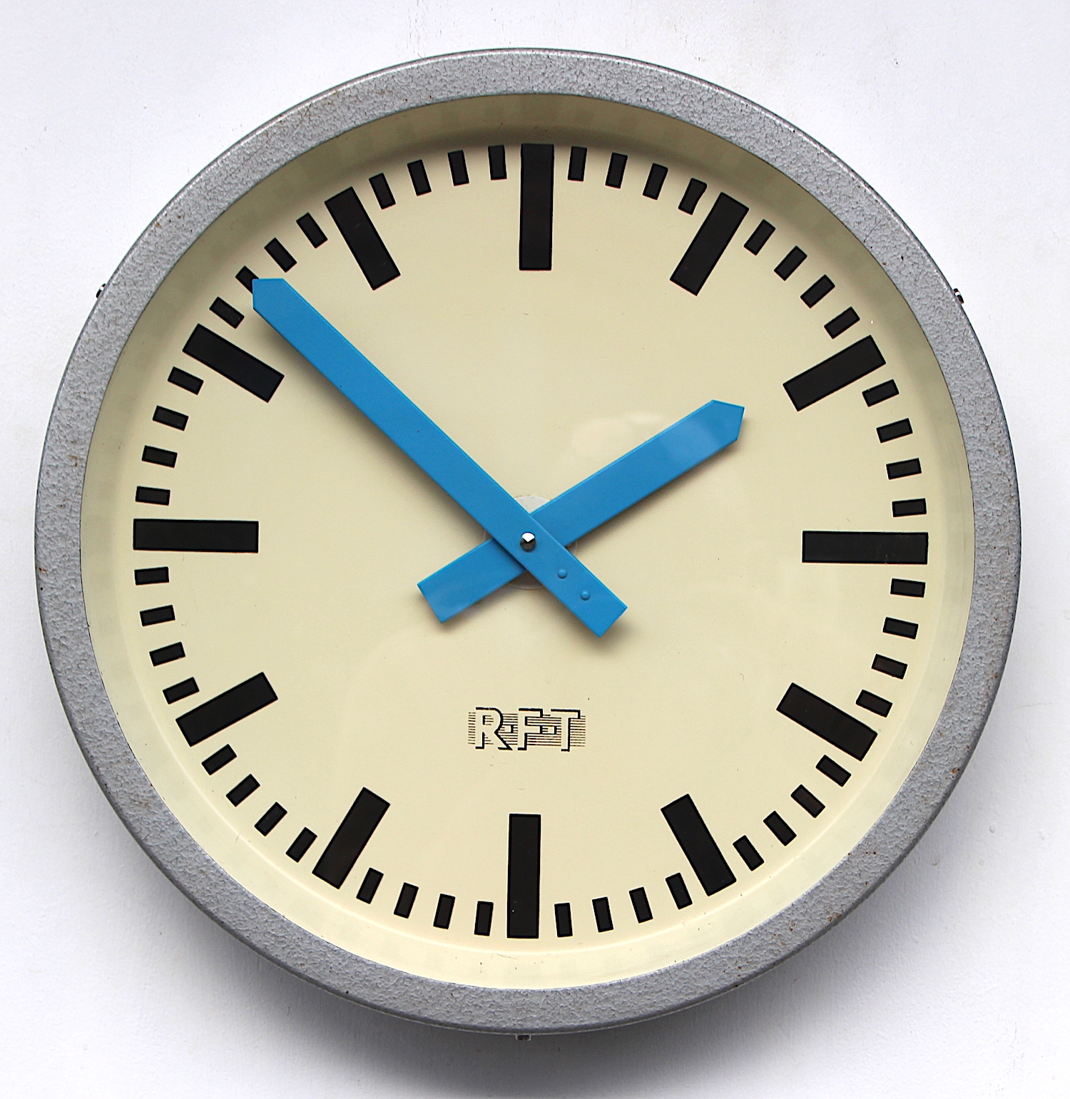A very smart factory/industrial vintage wall clock. Made by RFT (Rundfunk- und Fernmelde-Technik) in Leipzig, East Germany. This model is dated January 1969.